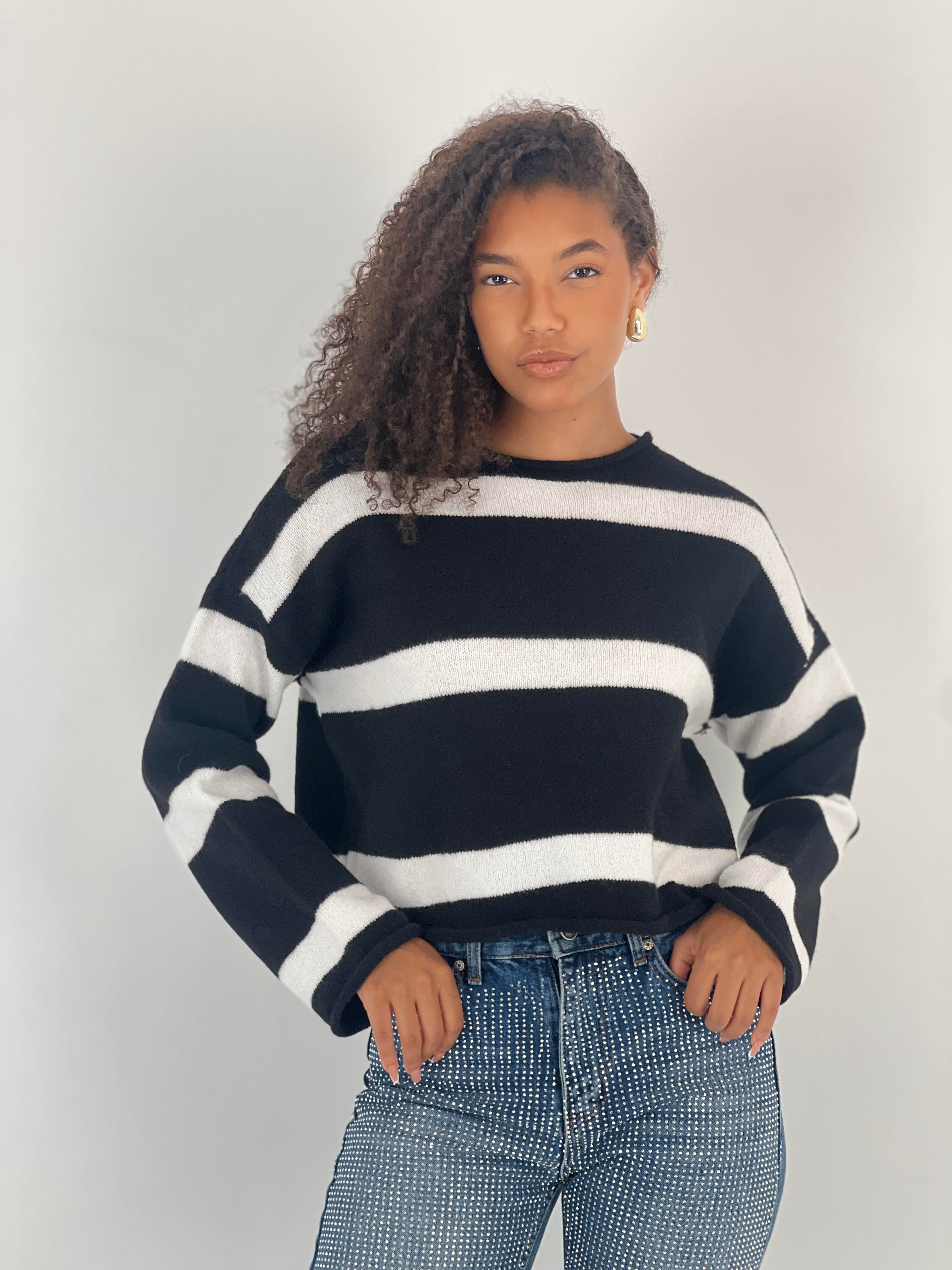 Klasik ve modern bir görünümü bir araya getiren bu geniş çizgili bisiklet yaka triko kazak, dolabınızın en dikkat çekici parçalarından biri olacak. Yumuşacık %100 akrilik kumaşıyla sıcak ve konforlu bir kullanım sunar. Geniş çizgili deseniyle iddialı bir stil oluştururken, bisiklet yaka kesimiyle zamansız bir şıklık yakalar. Her türlü alt giyimle kolayca kombinlenebilir.