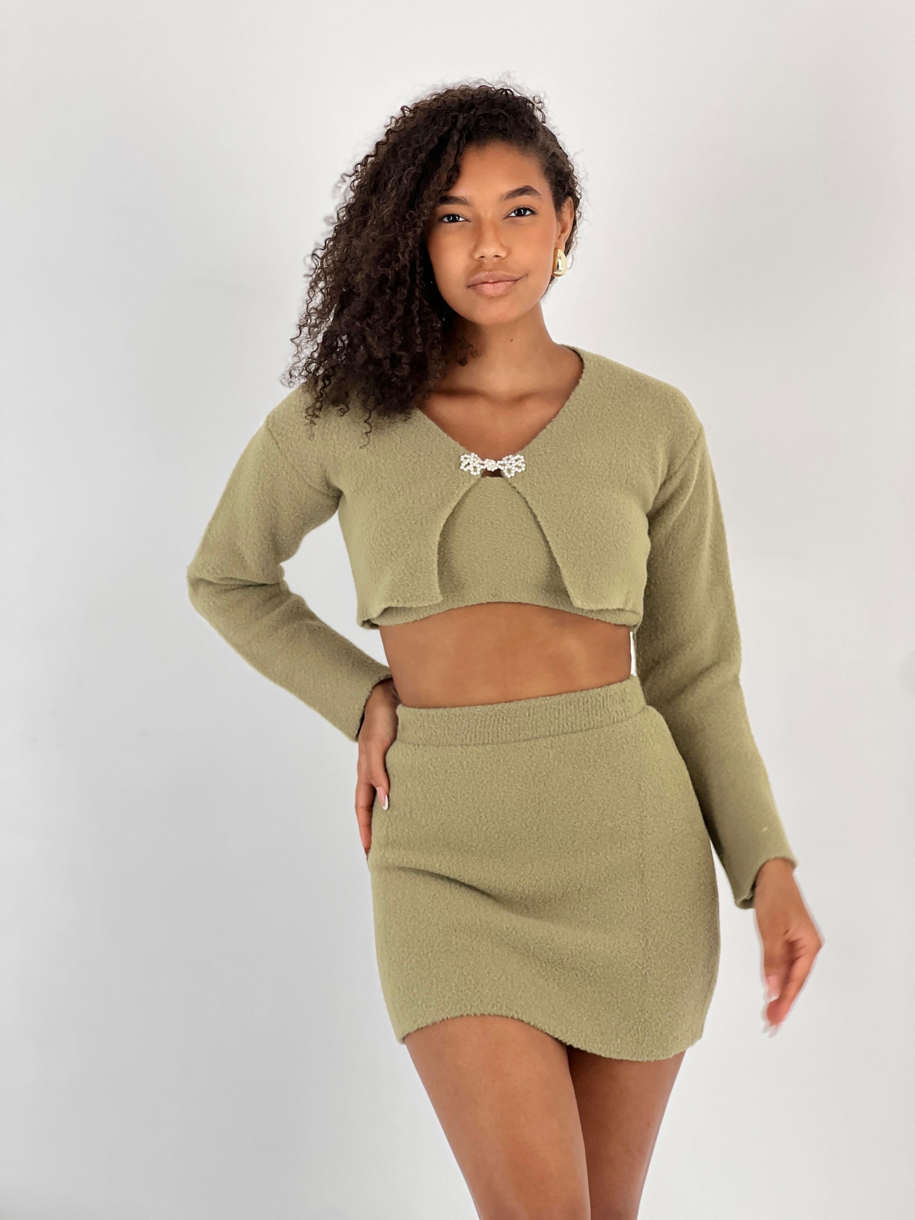 Pratik şıklığı ve bütünlüklü bir tarzı tek bir üründe arayanlar için tasarlanan bu aksesuar detaylı 3'lü triko takım, gardırobunuzun en işlevsel parçası olacak. %100 polyester kumaşı sayesinde hafif ve dayanıklı bir yapıya sahip olan bu takım, kolayca kırışmaz ve formunu korur. İç bluz, hırka ve pantolondan oluşan bu set, aksesuar detayıyla sofistike bir görünüm sunar.