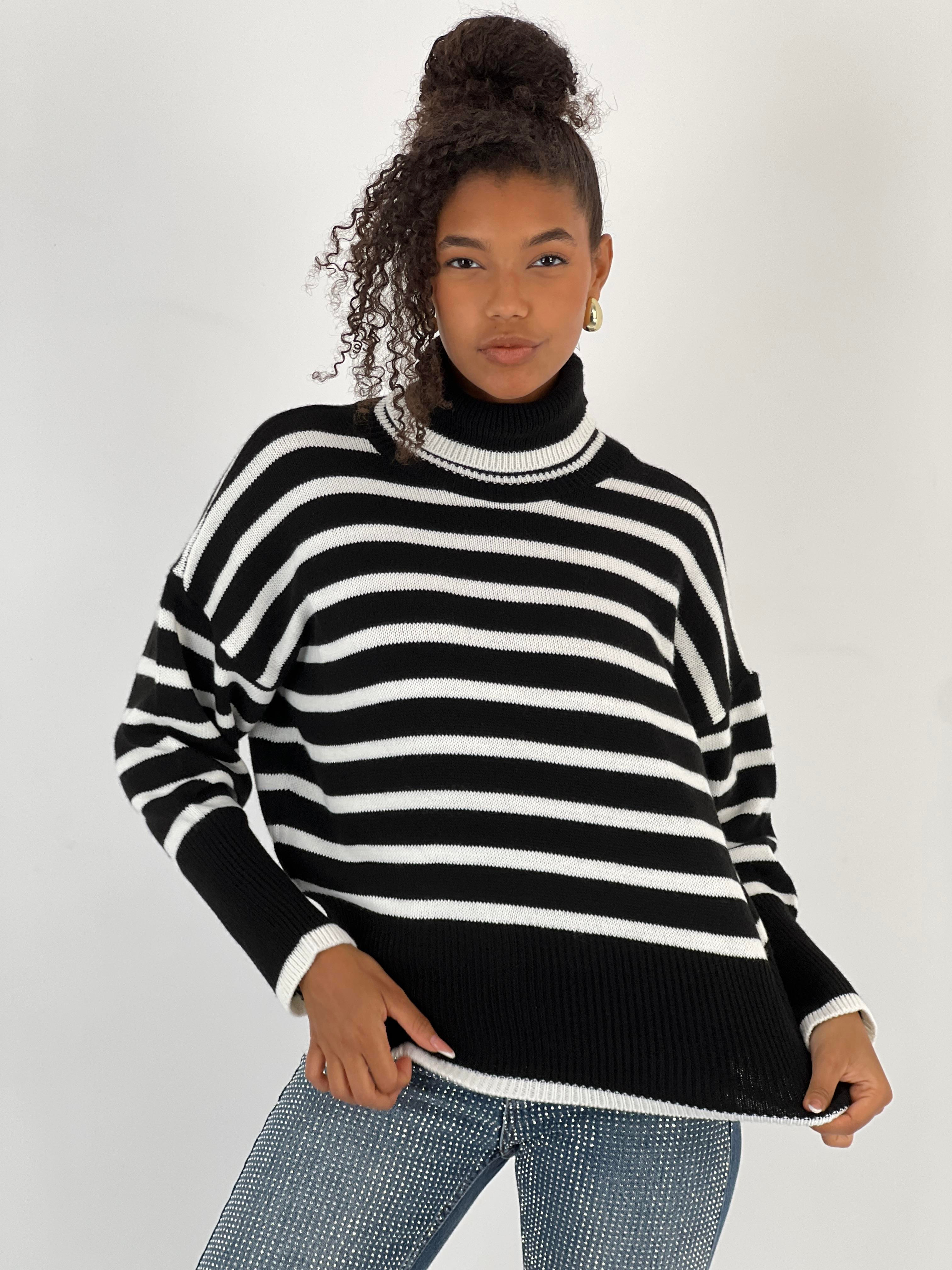 Zamansız şıklığın ve konforun birleşimi olan bu siyah beyaz çizgili balıkçı yaka kazak, gardırobunuzun en temel parçalarından biri olmaya aday. Yumuşacık %100 akrilik kumaşıyla sıcak tutarken, klasik balıkçı yaka ve çizgili deseniyle her kombine kolayca uyum sağlar. Gündüzden geceye zahmetsiz bir şıklık için idealdir.