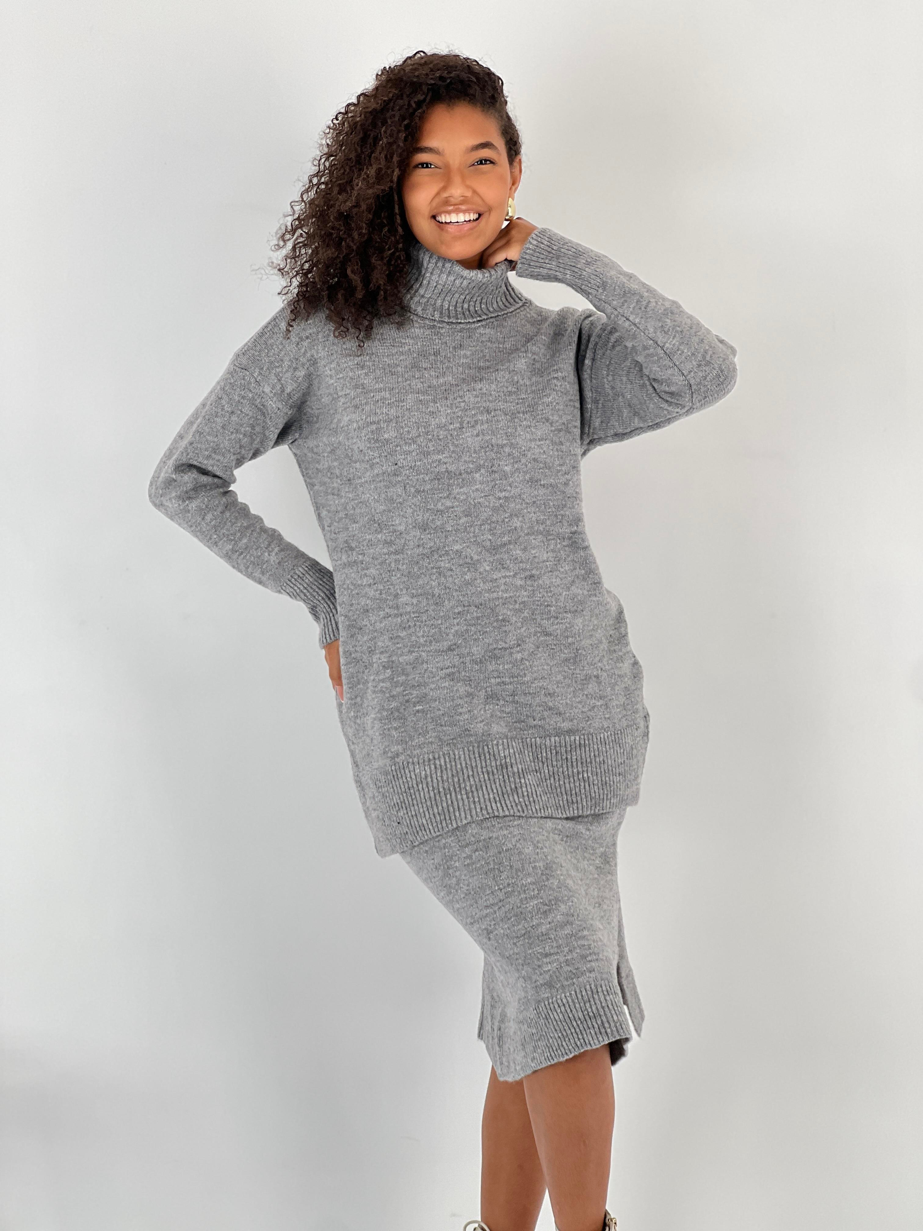 Zarafeti ve konforu bir arada sunan bu gri fitilli uzun kollu kazak ve yırtmaçlı etek takımı, tek bir dokunuşla şık ve sofistike bir görünüm yakalamanızı sağlar. Vücuda oturan fitilli dokusu, siluetinizi zarifçe vurgularken, eteğindeki yırtmaç detayı kombine modern ve çekici bir hava katar. Akrilik ve polyester karışımı, hem sıcak tutar hem de esnekliğiyle gün boyu rahatlık sunar.