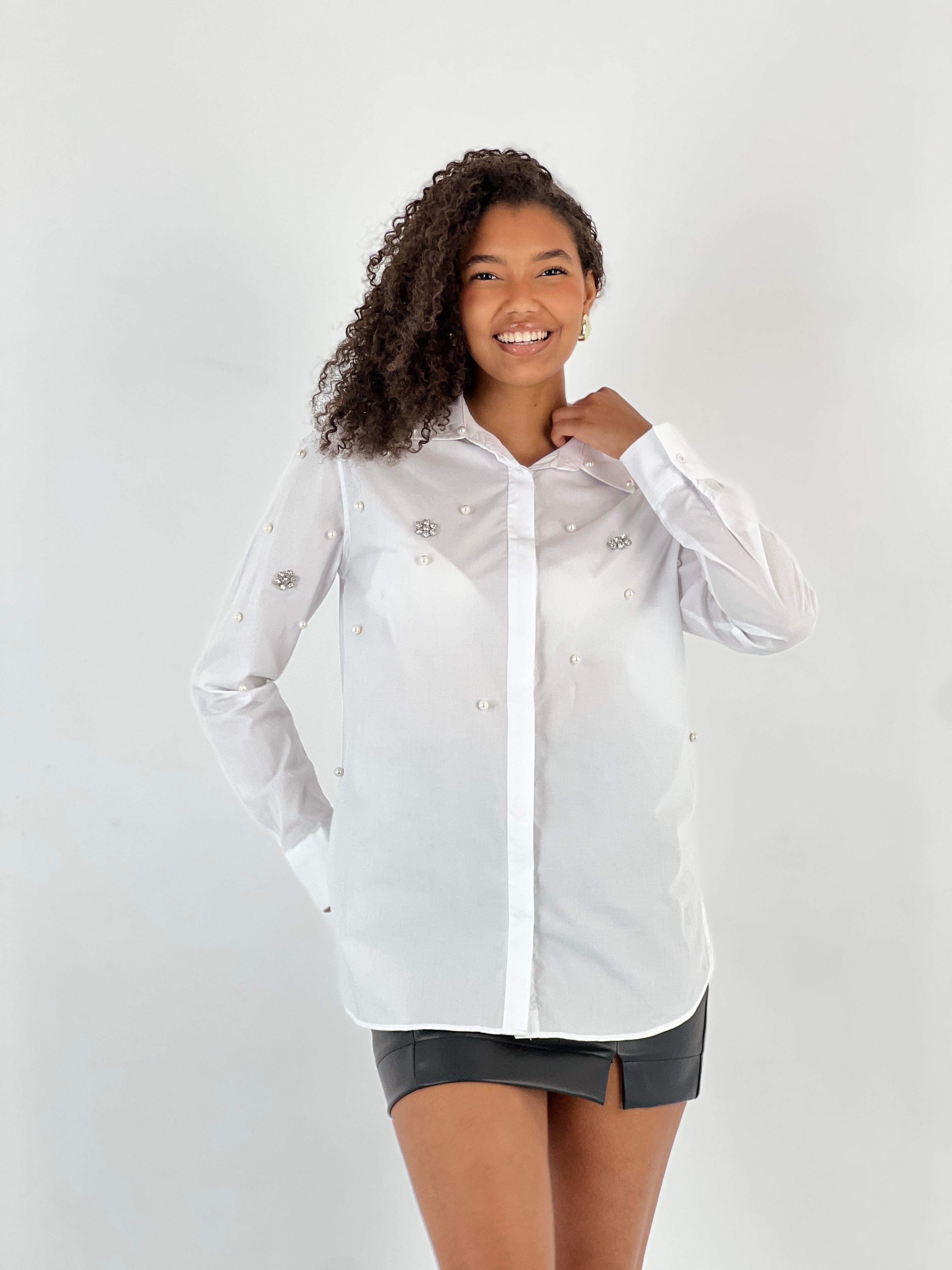 Klasik gömleğe modern ve ışıltılı bir dokunuş katan bu **inci taş detaylı gizli düğmeli beyaz gömlek**, zarafeti ve şıklığı bir arada sunar. **%97 pamuk ve %3 likra** karışımı sayesinde kumaşı esnektir, cildinize nefes aldırır ve gün boyu rahat bir kullanım sağlar. Gizli düğme detayı, gömleğe minimalist bir görünüm katarken, yaka ve manşetlerdeki inci ve taş işlemeleriyle özel bir parça haline gelir.