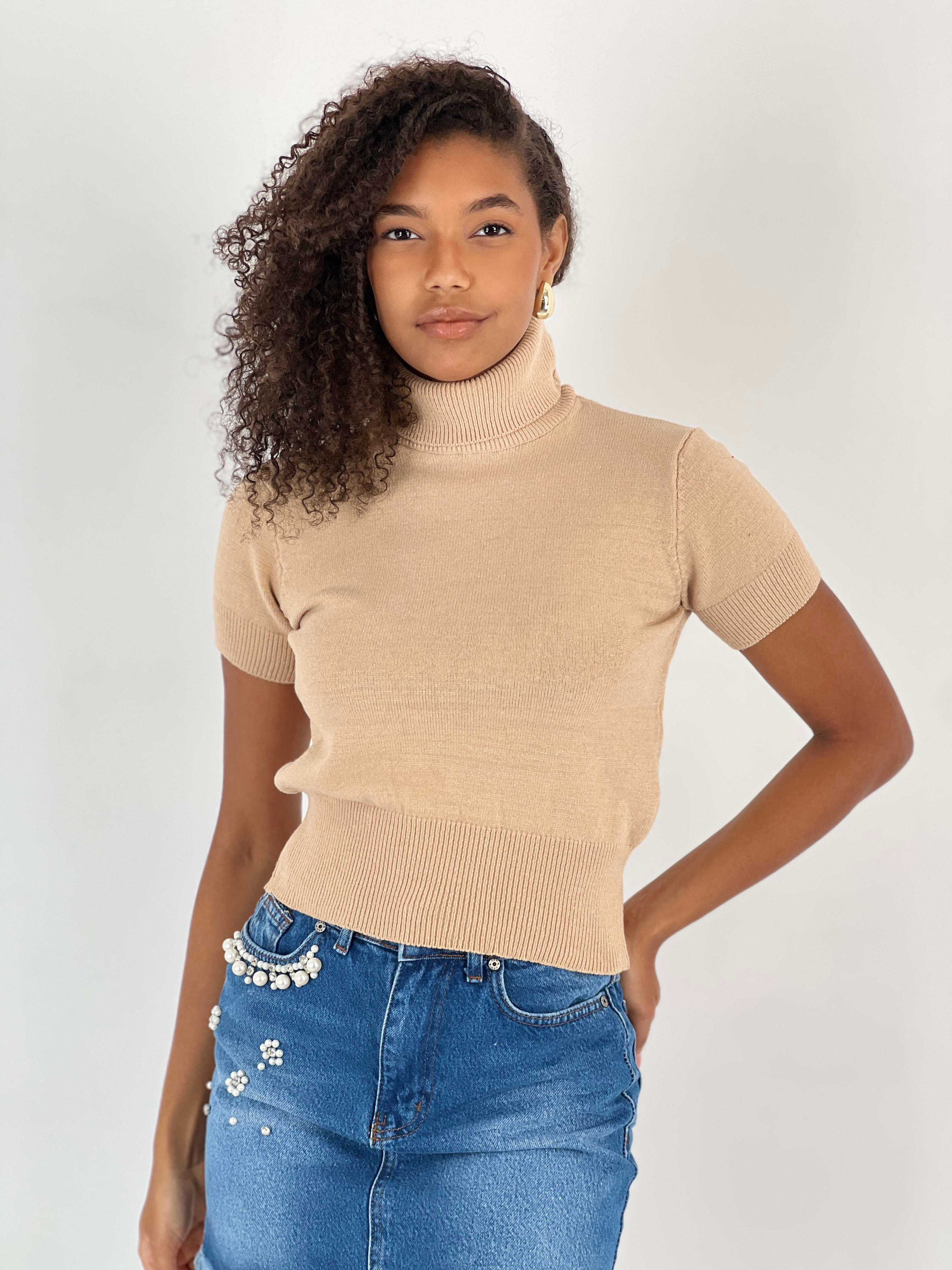 Zamansız şıklığı modern bir kesimle birleştiren bu kısa kollu boğazlı crop bej triko bluz, gardırobunuzun en işlevsel parçalarından biri olacak. Yumuşak dokulu viskon ve dayanıklı polyester karışımından oluşan kumaşı sayesinde gün boyu konfor sunar. Boğazlı yaka detayı, bluzunuza zarif bir hava katarken, kısa kesimiyle yüksek bel pantolonlar ve eteklerle harika bir uyum yakalar.