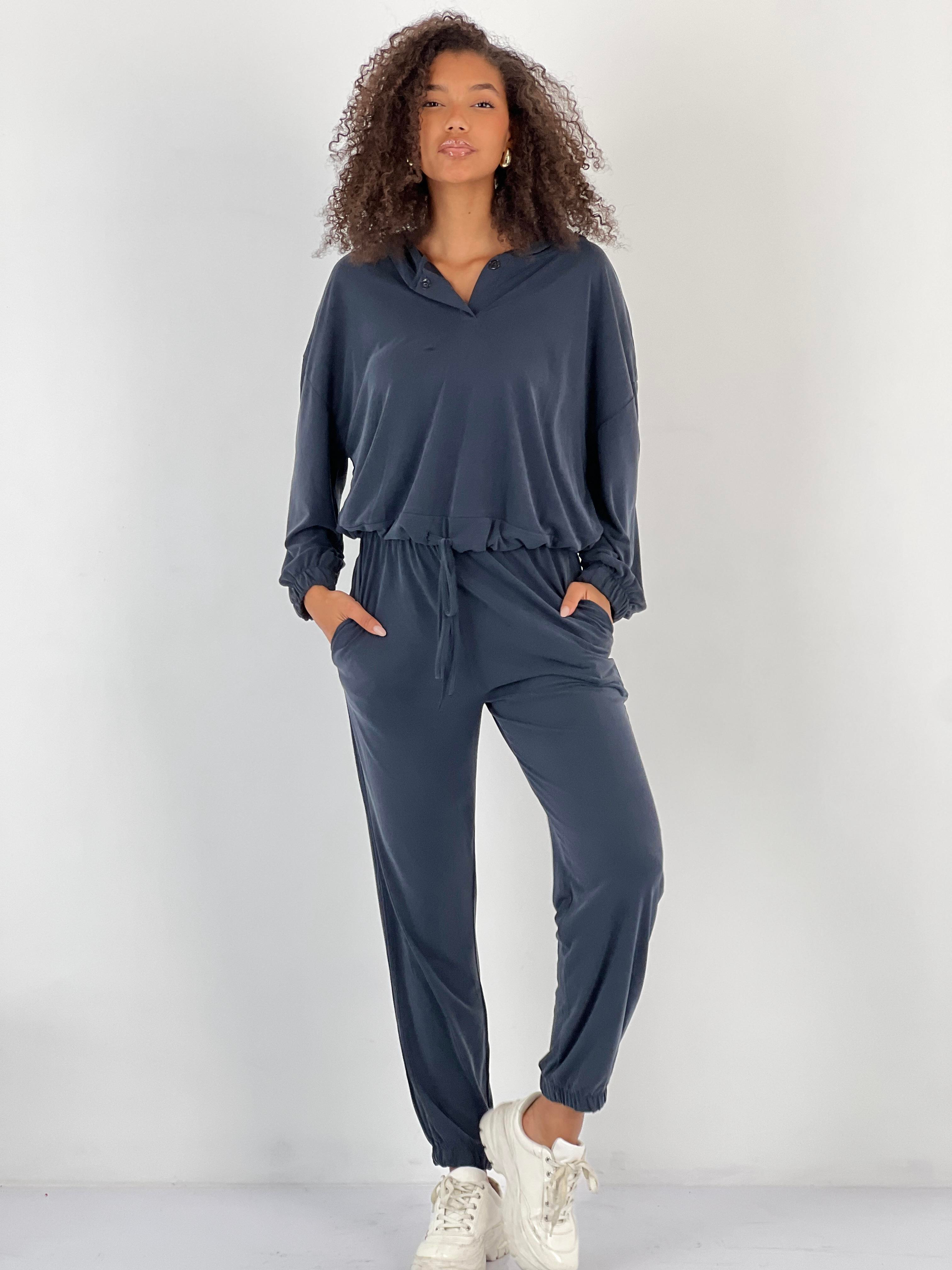 Rahatlığı ve şıklığı bir arada sunan bu **kol ve paçaları lastikli kapüşonlu siyah ikili takım**, günlük giyim ve spor aktiviteleriniz için mükemmel bir tercihtir. **%95 pamuk ve %5 elastan** karışımı sayesinde kumaşı yumuşak, esnek ve nefes alabilir bir yapıya sahiptir. Kapüşon detayı ve lastikli manşetler, takıma modern ve sportif bir hava katarken, tam uyumlu pantolonuyla kusursuz bir görünüm sağlar.
