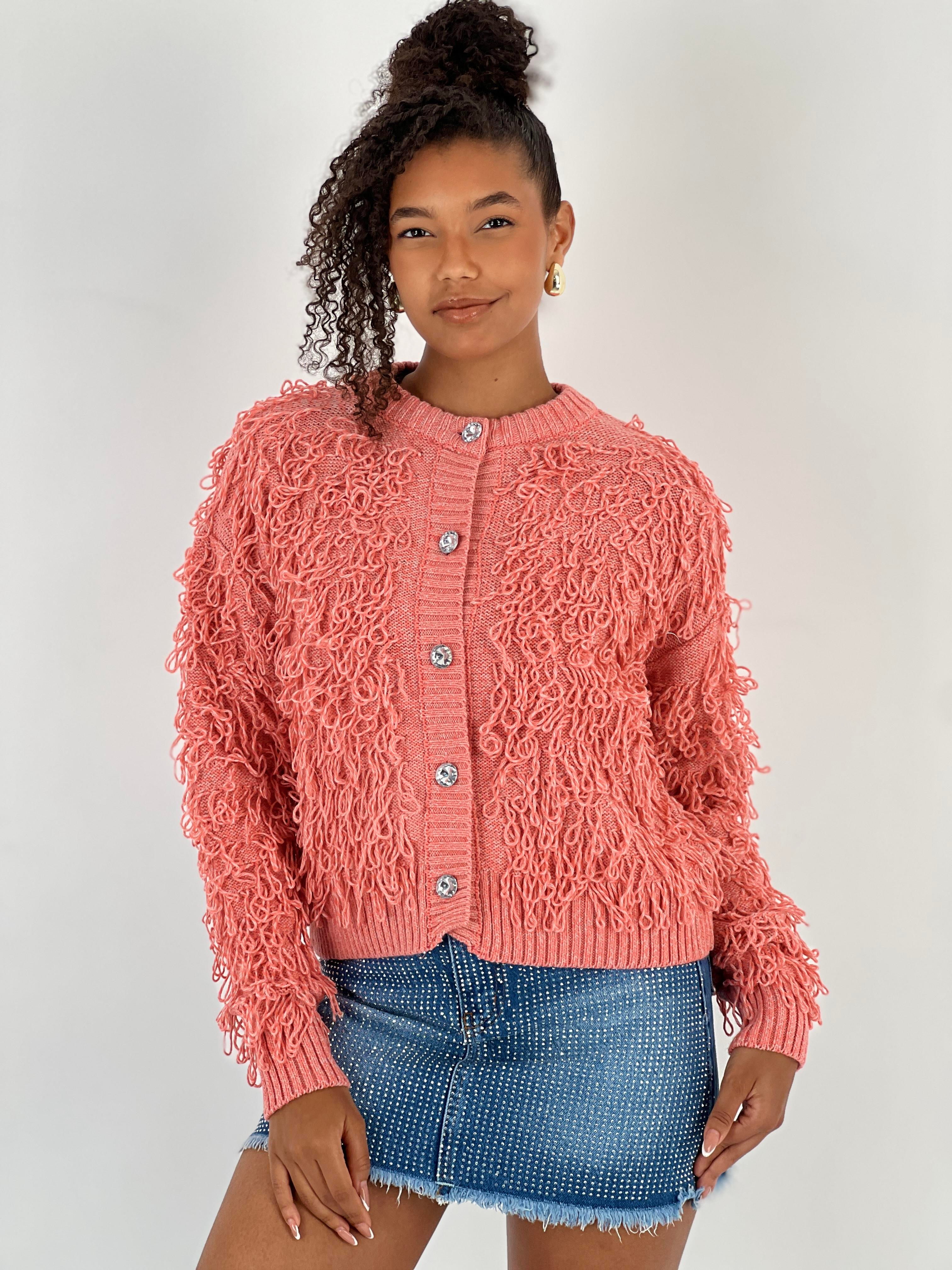 Rahat ve bohem bir stilin anahtarı olan bu püskül detaylı düğmeli hırka, gündelik kombinlerinize hareket katacak. Yumuşak triko dokusu ve salaş kesimiyle gün boyu konfor sunarken, ön kısmındaki düğmeler ve canlı püskül detayları sayesinde sıradanlıktan uzak bir görünüm yaratır. Bu hırka, ister kapalı ister açık olarak kullanılabilecek çok yönlü bir parçadır.