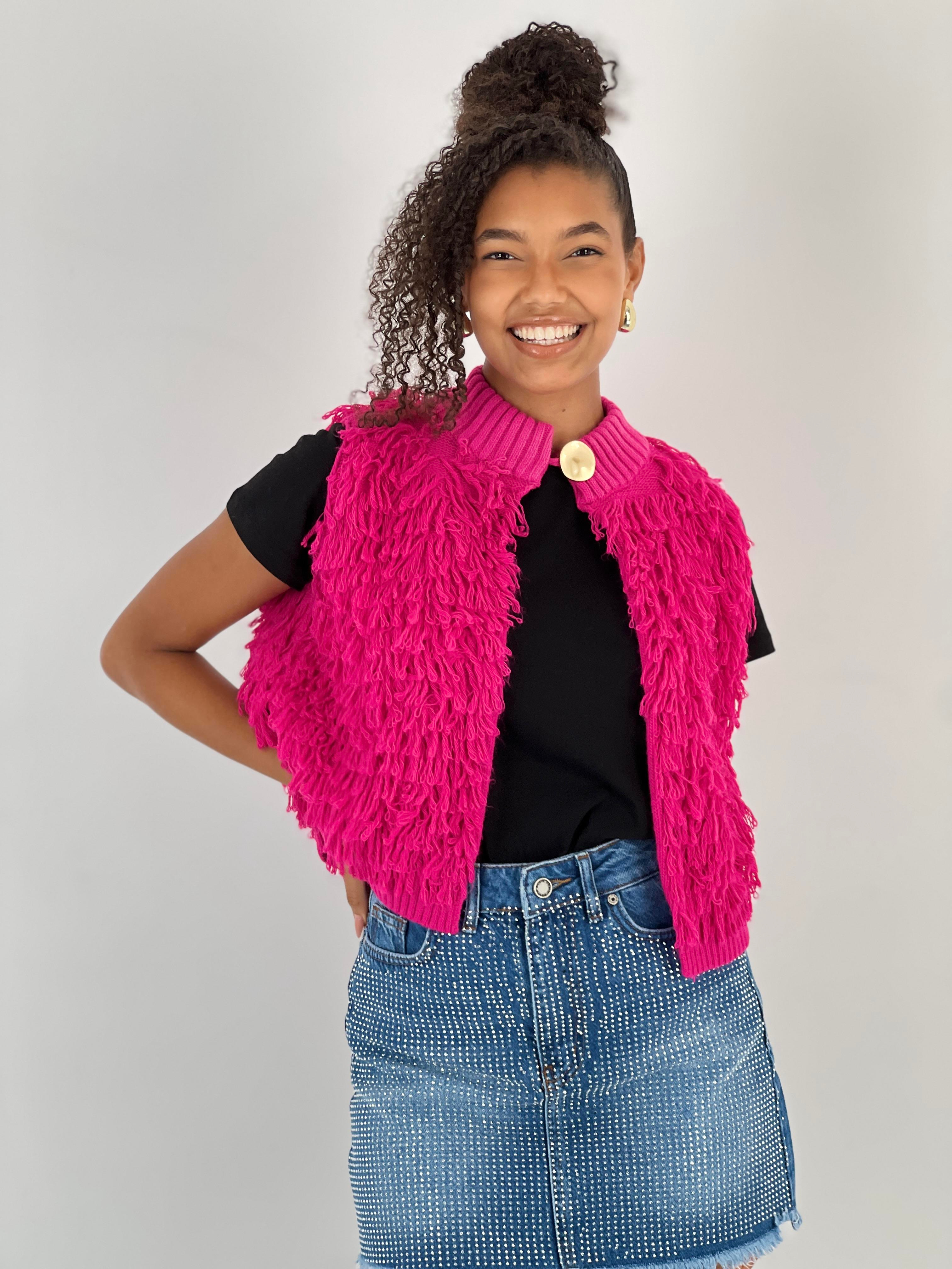 Kadın V Yaka Püsküllü Fuşya Triko Kazak-33354
