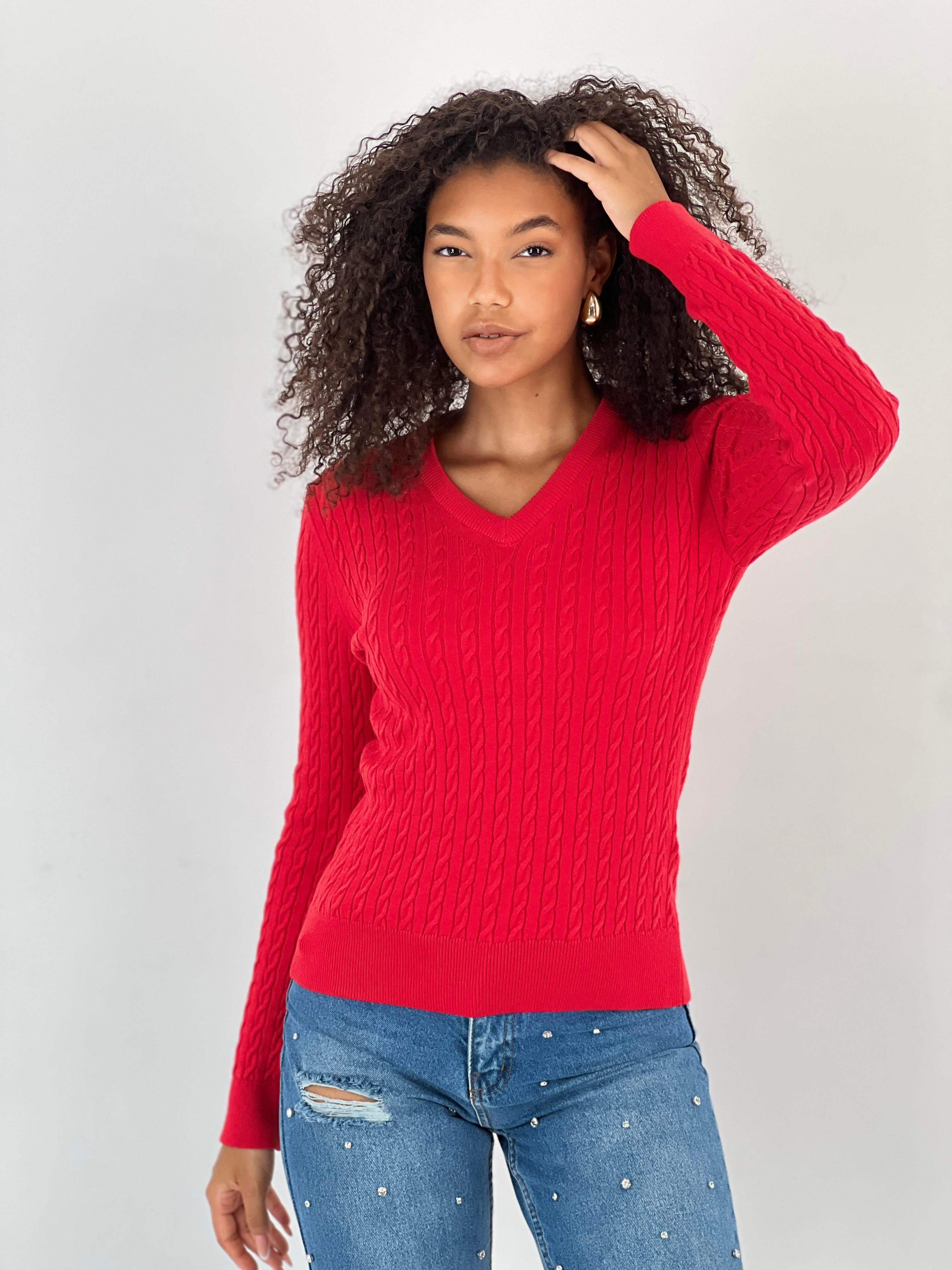 Klasik ve sofistike bir tarzın temsilcisi olan bu V yaka saç örgü desenli triko kazak, gardırobunuzun en zarif parçalarından biri olacak. Viskon, poliamid ve polyester karışımından oluşan yumuşak dokulu kumaşıyla hem rahat hem de sıcak tutar. Saç örgü deseni kazaklara zamansız bir hava katarken, V yaka kesimi boynunuzu daha uzun göstererek şık bir duruş sağlar.