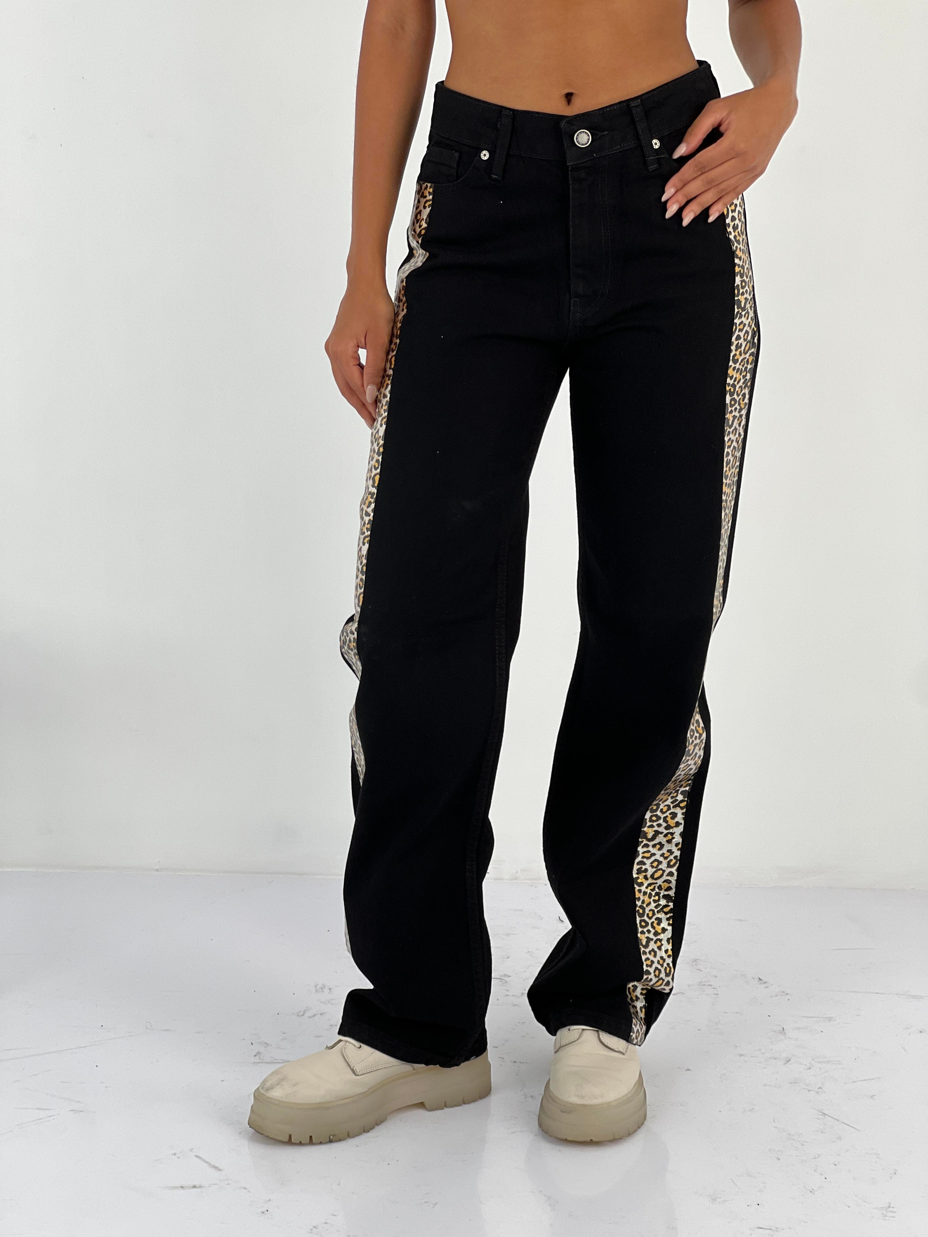Klasik siyah jean pantolona modern ve cesur bir yorum katan bu **yanları leopar desenli kot pantolon**, stilinize iddialı bir hava katacak. **%100 pamuk** kumaşı sayesinde nefes alabilir ve dayanıklı bir yapıya sahip olan bu jean, yan kısmındaki leopar desenli şeritlerle dinamik ve göz alıcı bir duruş sergiler. Hem rahat hem de trend bir parça arayanlar için idealdir.